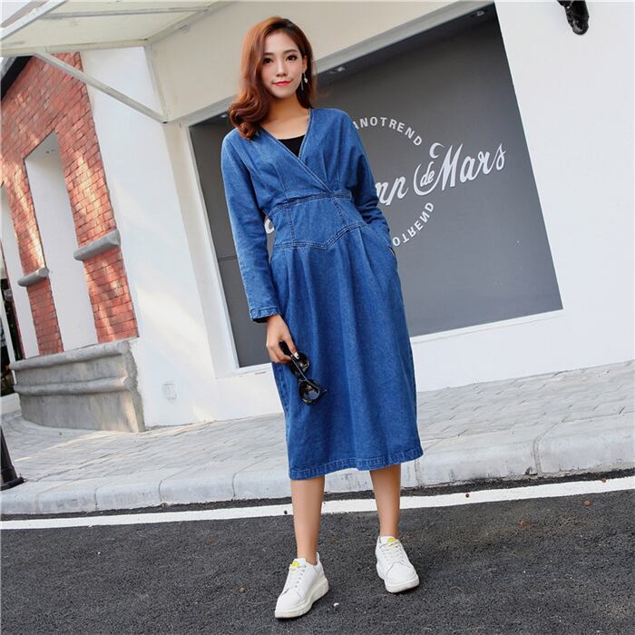 Vネック 長袖 ミディ丈 デニムワンピース
