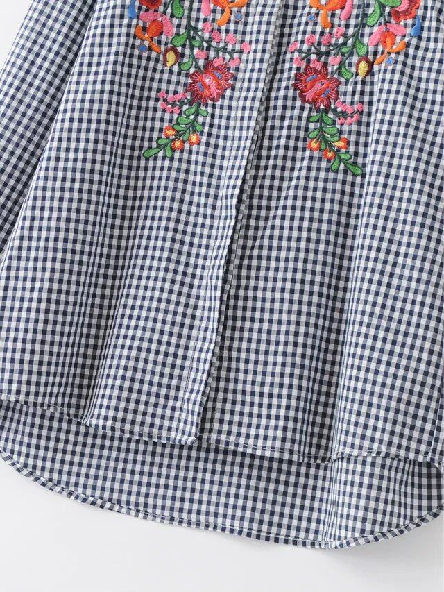 ロング丈 長袖 花刺繍 チェック 襟付きシャツ