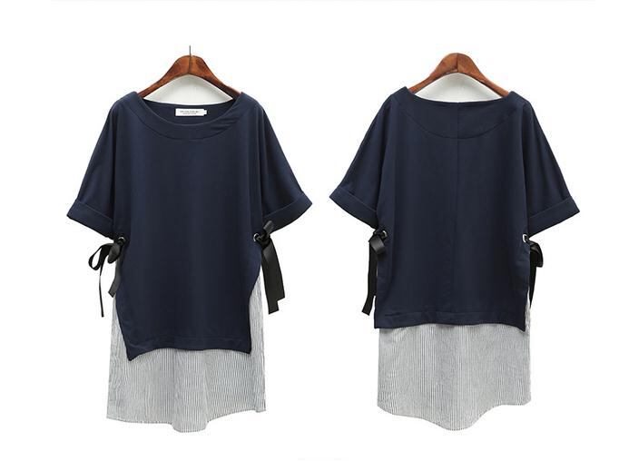 五分袖 無地 ストライプ サイドリボン ワンピース