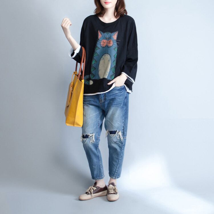 七分袖 ラウンドネック ゆったりカットソー ネコ