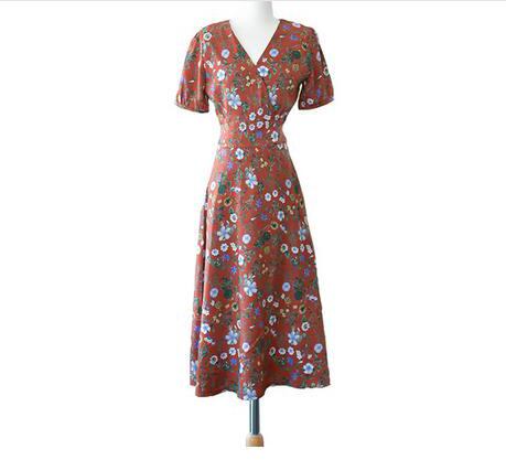 ネイビー/ブラウンの落ち着いたカラーと大人っぽい花柄が特徴的なワンピース♪