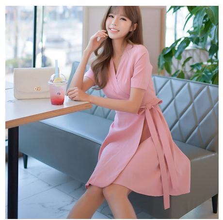 Vネック ラップ 半袖 無地 フレア ワンピース