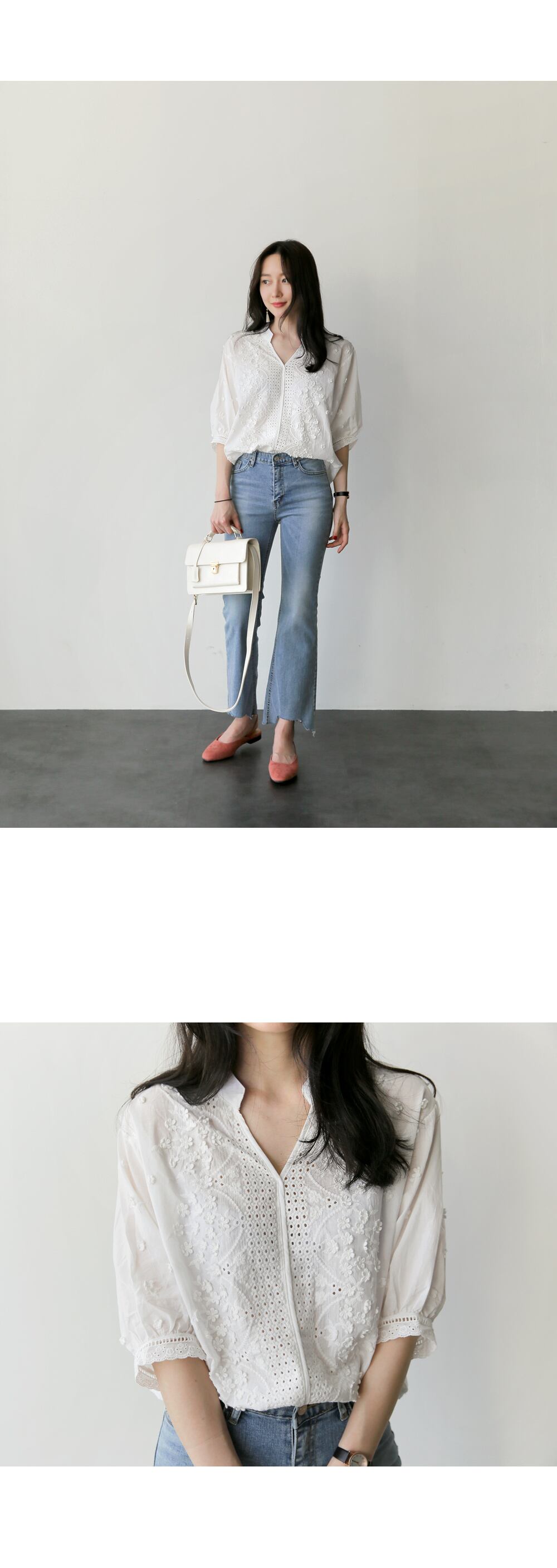 花柄 パンチングレース ノーカラー ブラウス