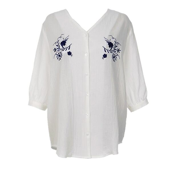 七分袖 ノーカラー Vネック 花刺繍ブラウス