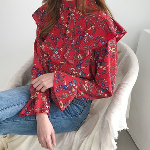 春にマストな花柄ブラウスにフリルで大人可愛い印象。