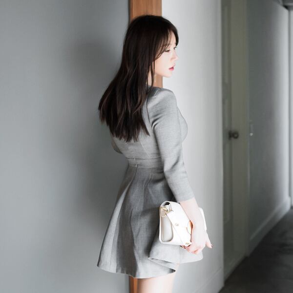 ちょっぴりセクシーなカシュクールの胸元、ウエストのパールボタンが可愛いフレアワンピースです。