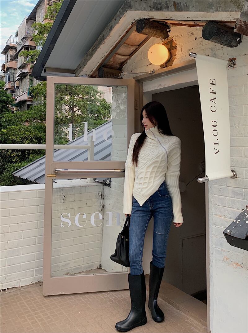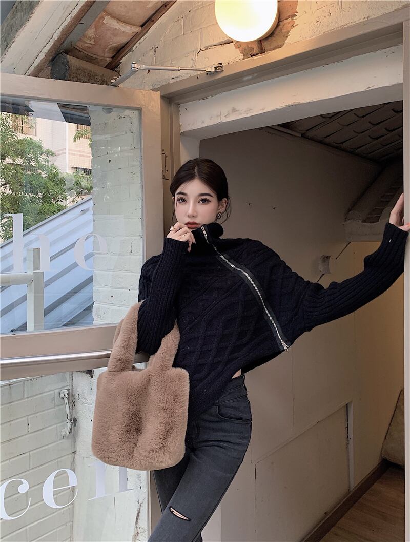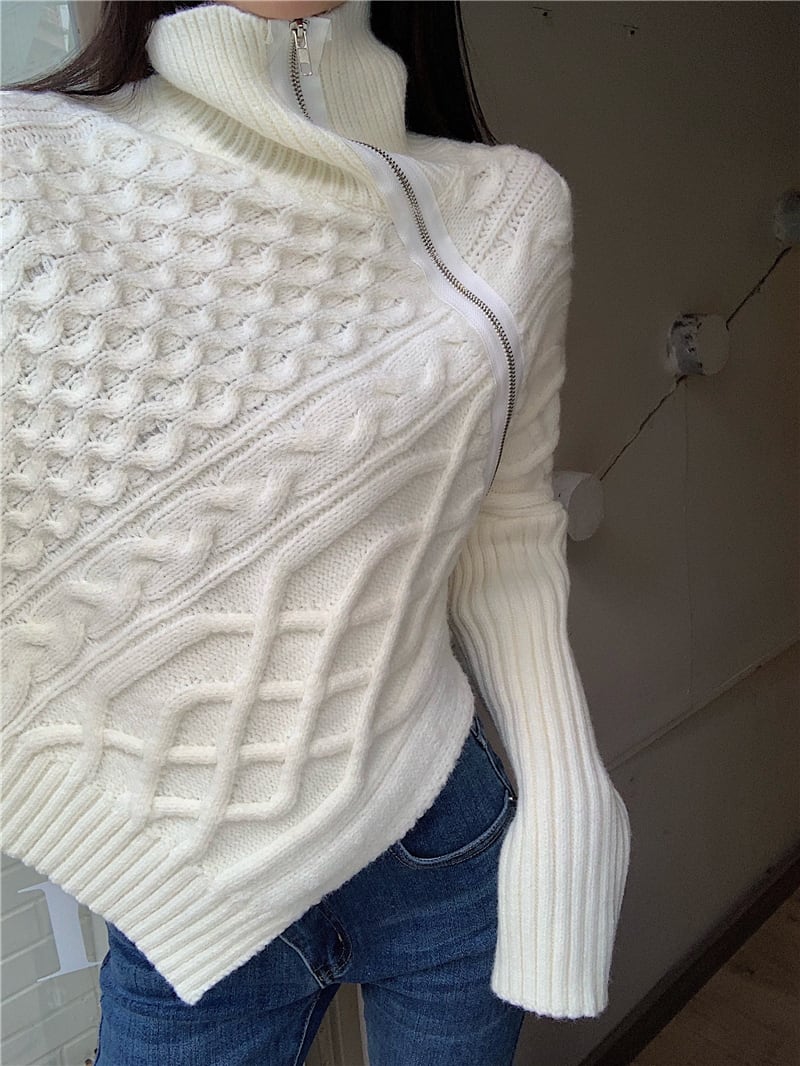 サイドジップ ケーブルニットレディース トップス ニット カラー 襟 長袖 ジップアップ ケーブルニット ショート丈 無地 ユニーク カジュアル