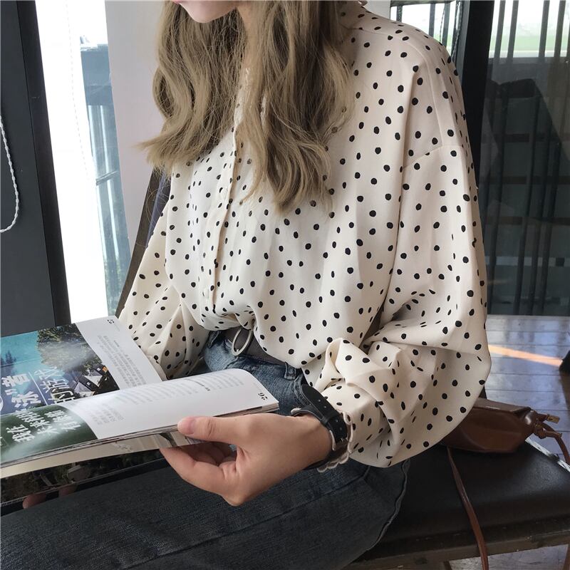 ネックラインと袖口のレースが可愛らしいドット柄のブラウス