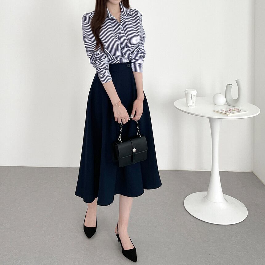 ワンピース シャツ ブラウス ロングスカート ロング丈 長袖 襟付き Aライン 大人可愛い きれいめ 大人 上品 おしゃれ ストライプ 春 秋 入学式 入園式 卒業式 卒園式 謝恩会 10代 20代 30代 40代 50代 オフィス ビジネス OL 通勤 学生 通学 デート お出かけ 着回し 韓国 ファッション スタイル 新作 フリーサイズ ブルー アプリコット