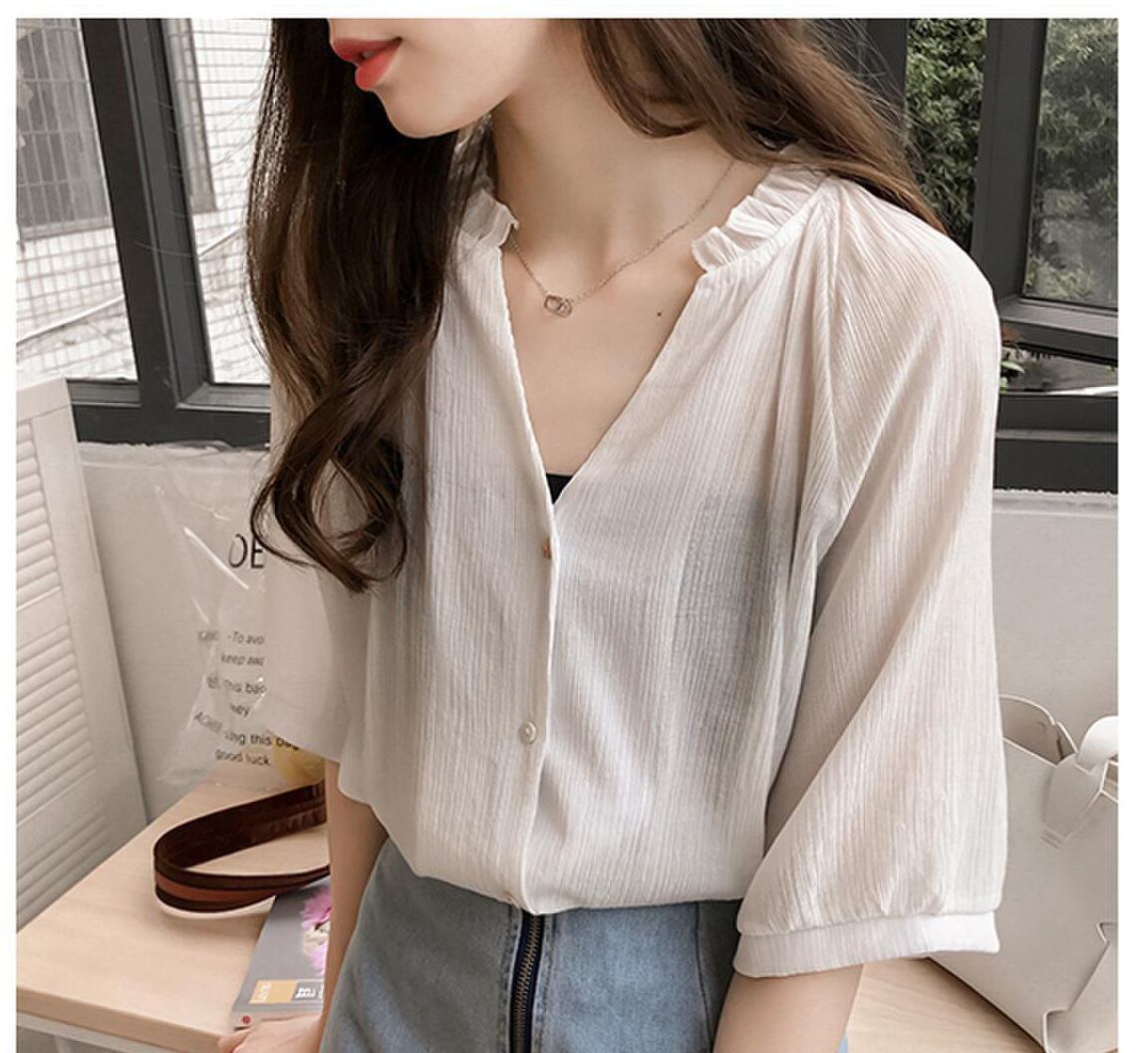 新作 可愛い トレンド ブラウス 無地 Vネック レース シャーリング 二次会 日常 通勤通学