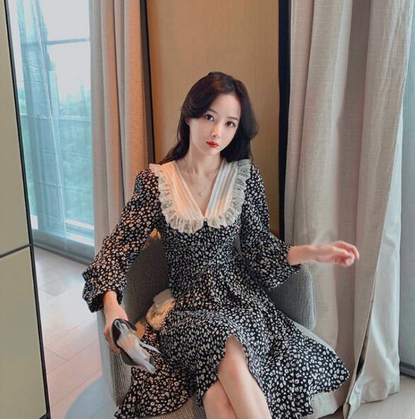 春夏新作 シフォン レースカラー ワンピース 花柄 Vネックトレンド 着回し