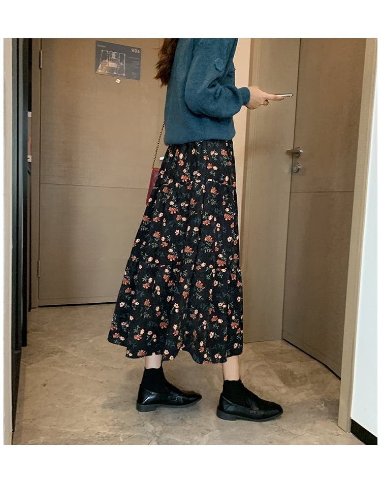 春夏新作 トレンド ロング 花柄 ティアードスカートコーデュロイ カジュアル 着回し ワンマイル 日常