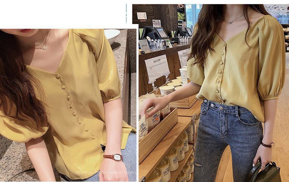 新作 トップス シフォン Vネック ノーカラー カジュアル きれいめ 半袖 体系カバー バルーンスリーブ