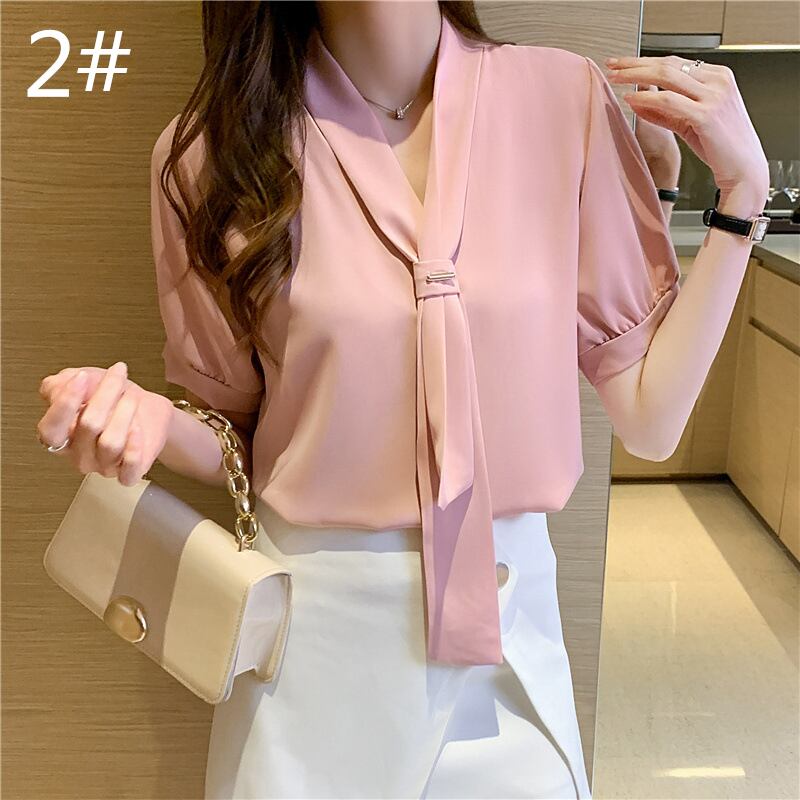 2022春夏新作 半袖 シフォンブラウス リボン付き Vネック レディース オフィス 20代 30代 40代