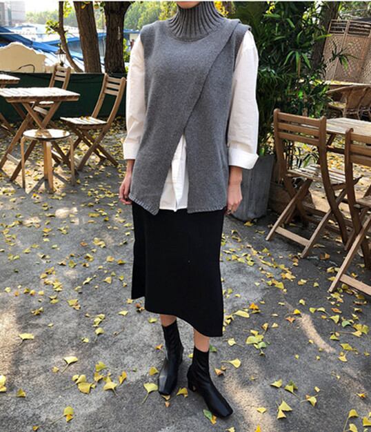 秋冬新作 ニットベスト トップス タートルネック スリット レディース 体型カバー シンプル