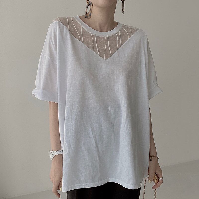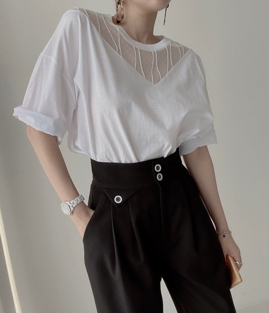 2022春夏新作 レース切替 Tシャツ 人気 tシャツ スリット 半袖 レディース おしゃれ スタイリッシュ
