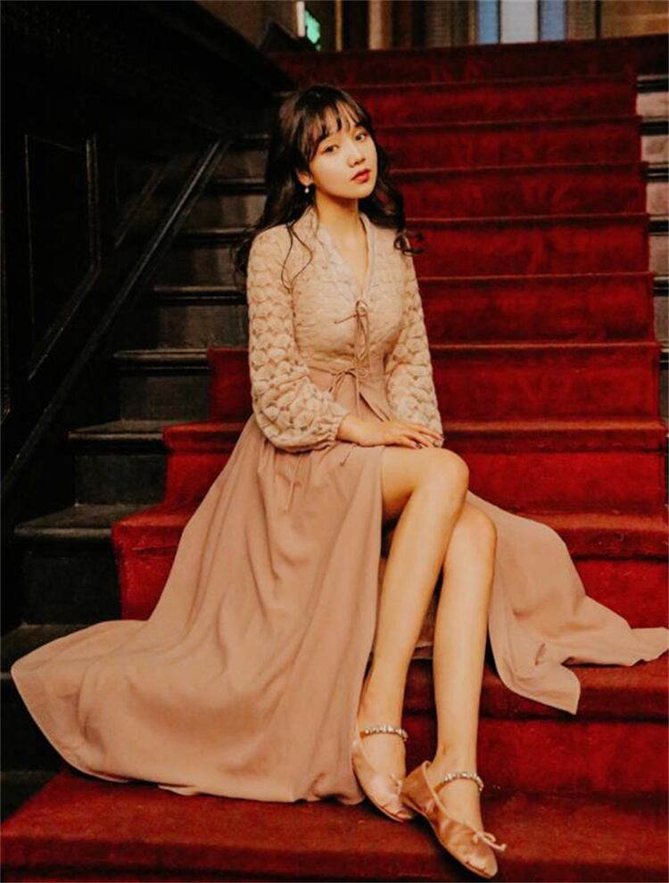 素晴らしい レトロ 中空 レース デザインセンス 改良された漢服 気質 ワンピース