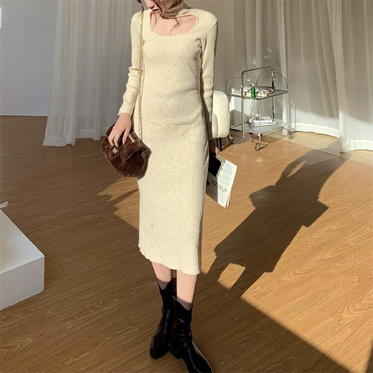 見た目カワイイ タートルネック デザインセンス ニットワンピース スリム ロングスカート