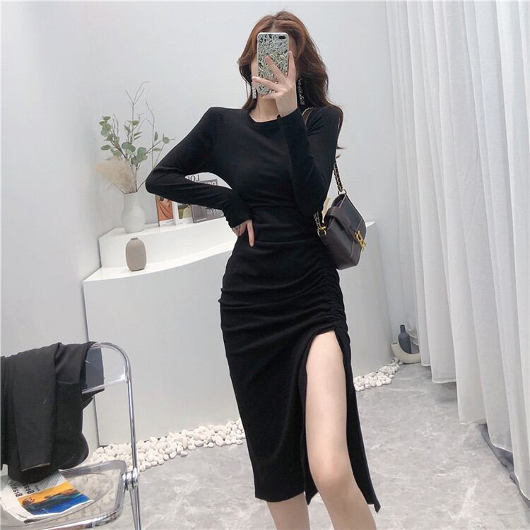 オシャレ 無地シンプル 長袖ワンピース巾着フォールドスリムスリット中・長セクション