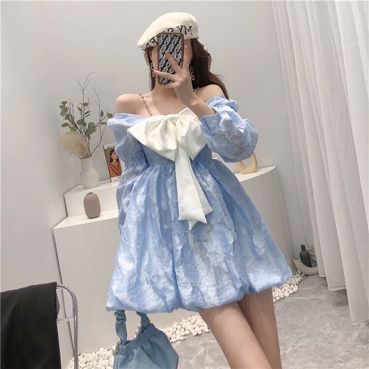 洗練されたシルエットsweet系 蝶結び ダイヤモンドスリングオフショルダー 長袖 スリムワンビース