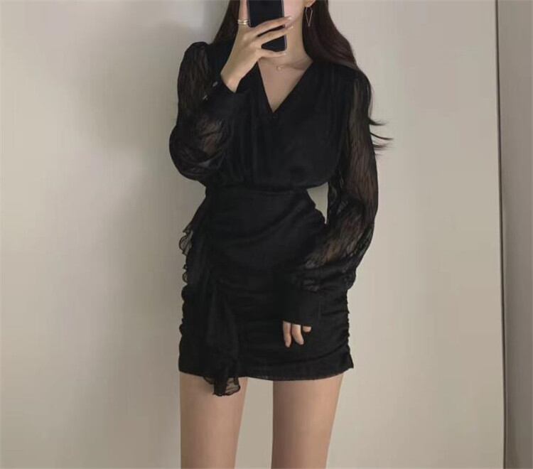 フレンチ エレガント Vネック エレガント スリム 縫付 タイトスカート ワンビース フリル 長袖 ミニスカート