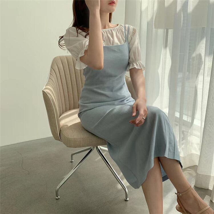 韓国語版 キャミ・ベアワンビス スリムフィット ハイウエスト トップス ロングスカート パフスリーブ 2点セット