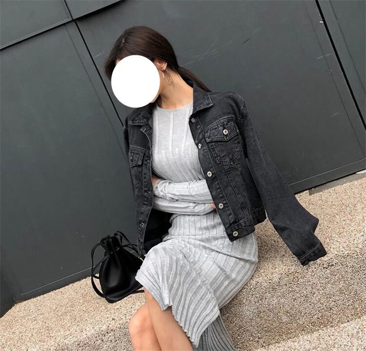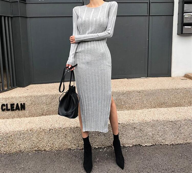 スリム ニット スプリット タイトスカート セータードレス ラウンドネック 中・長セクション