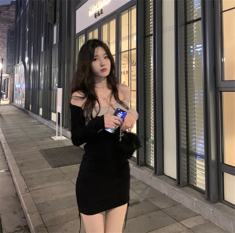 デートテクニック コントラストカラー 縫付 オフショルダー 伸縮性 スリム タイトスカート
