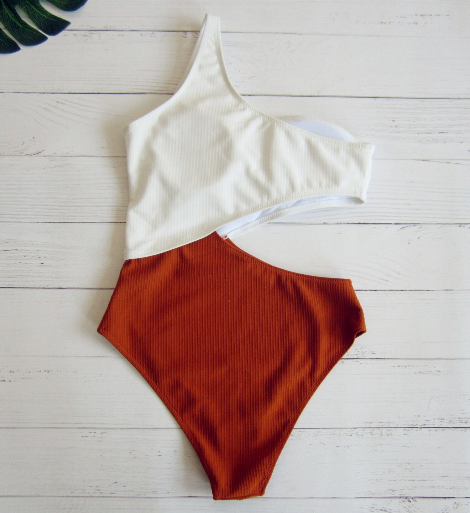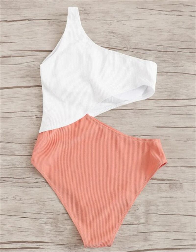 ワンショルダータイプのワンピース水着は、デザイン性が高いカットオフタイプです。