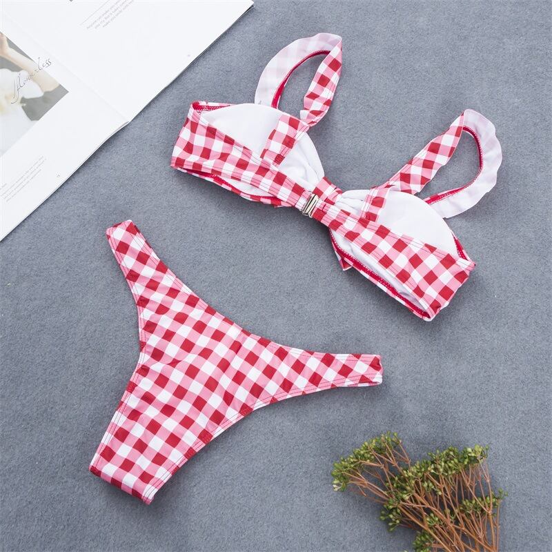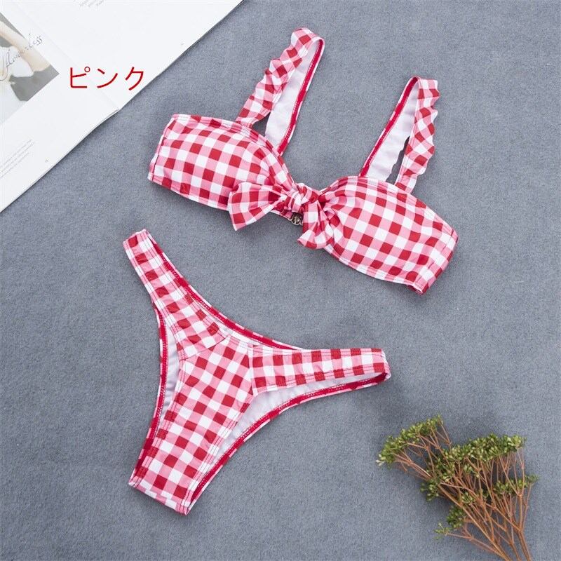 セクシーなチェック柄ビキニ 胸もとリボン パッドポケットあり
