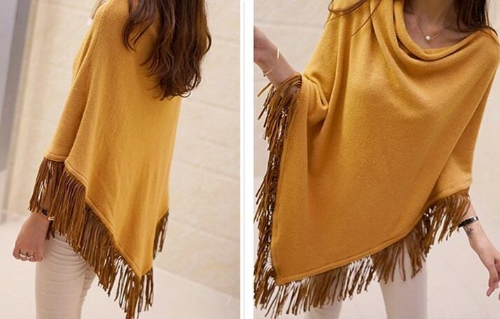 フリンジ付きニットポンチョ タッセル付きニットポンチョ