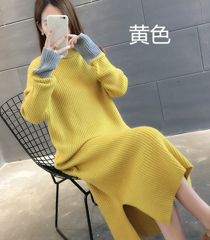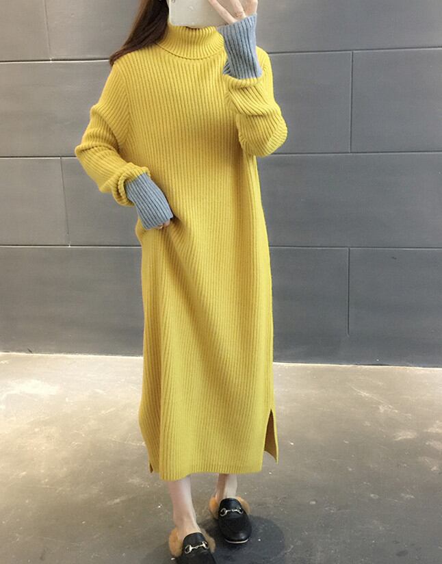 デイリー使いしたくロング丈ニットワンピース。大人可愛いリブニットワンピースです。ハイネックとスリット入りが女性らしい。カジュアルからキレイ目まで相性バッチリの着回し力!