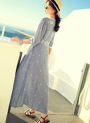 《カジュアルワンピース》花柄刺繍 ボヘミアンデザイン マキシワンピース