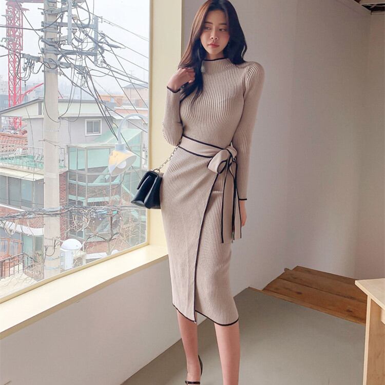 ニット ワンピース ミディアム丈ワンピース ボトルネック リボン 蝶結び 韓国ファッション 秋 冬 新作