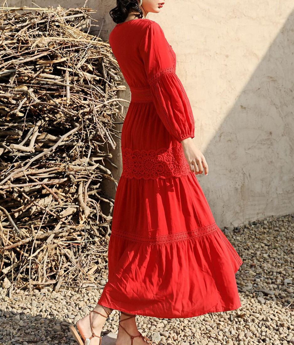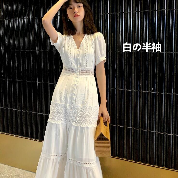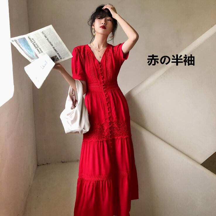 Vネックワンピース 白 リゾート 2022夏 マキシワンピース レッド 赤 長袖/半袖 ワンピース
