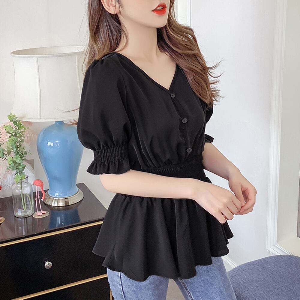 シャツ シャーリング カットソー パフスリーブ 体型カバー トップス シフォン 夏 半袖 カジュアル デコルテ 可愛い 襟なしシャツ 通勤 プルオーバー 無地