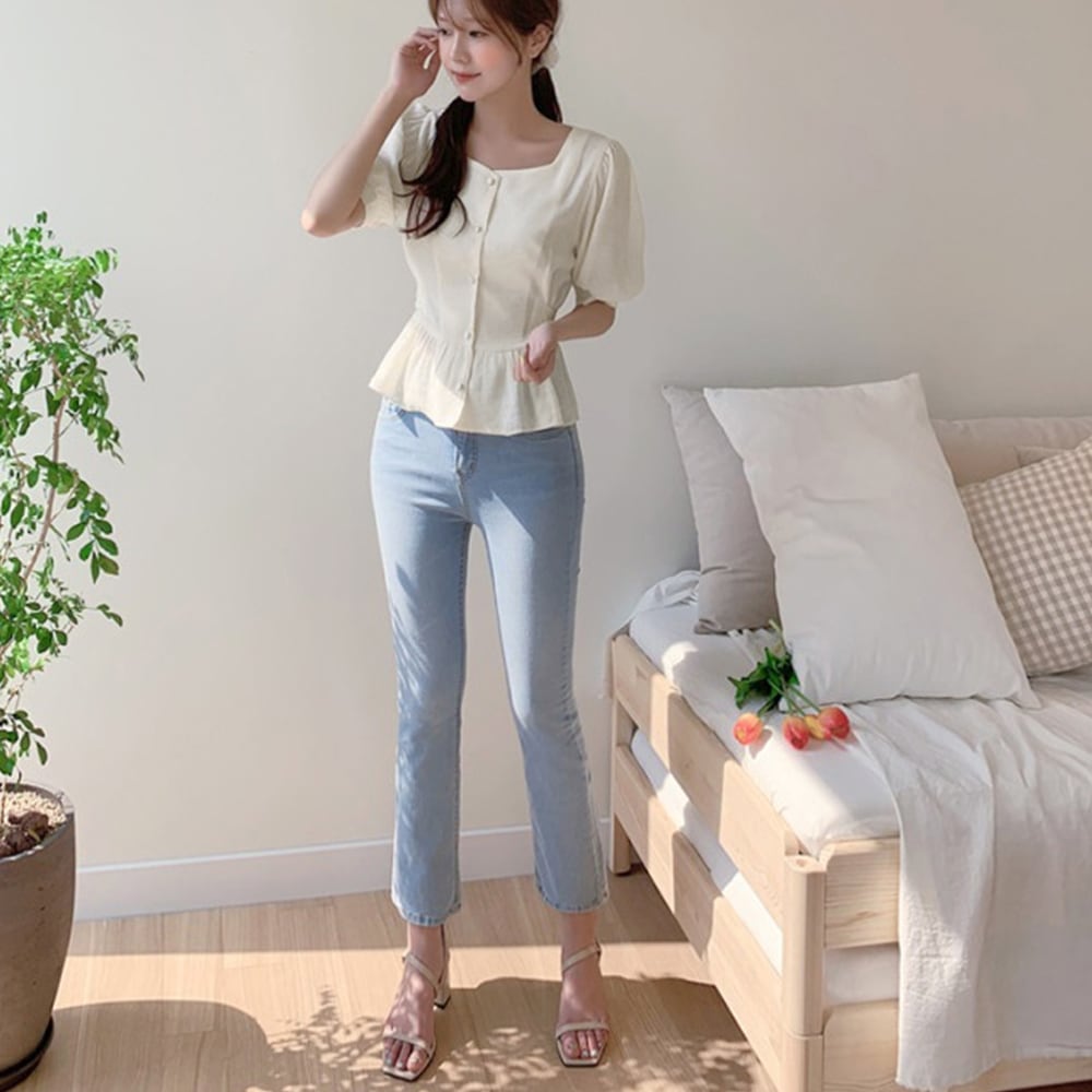 フロントボタンが品良く映えるアクセント、デコルテをすっきりと見せるスクエアネックブラウス 長めの5分袖が気になる二の腕をうまくカバー、