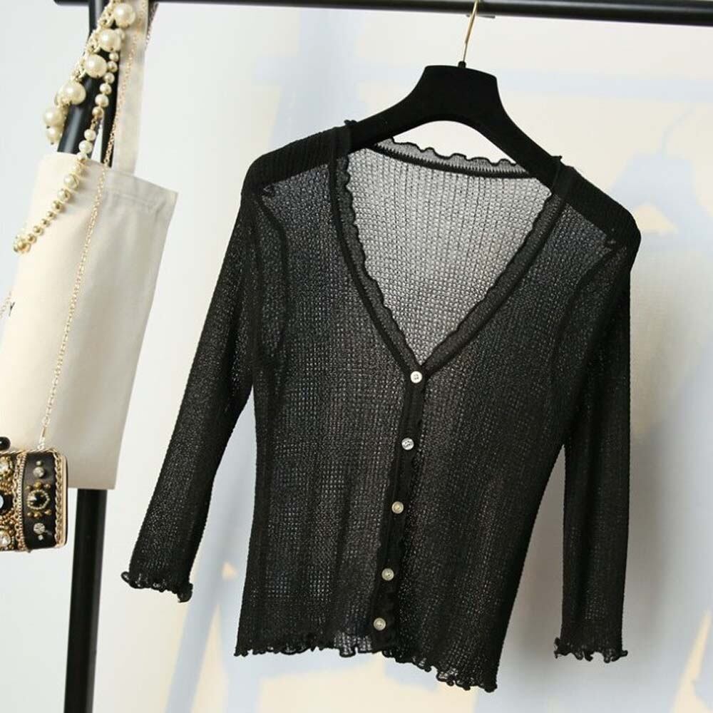 フリルが可愛い、Vネックサマーニットカーディガン 薄手の生地なので持ち歩きに最適です