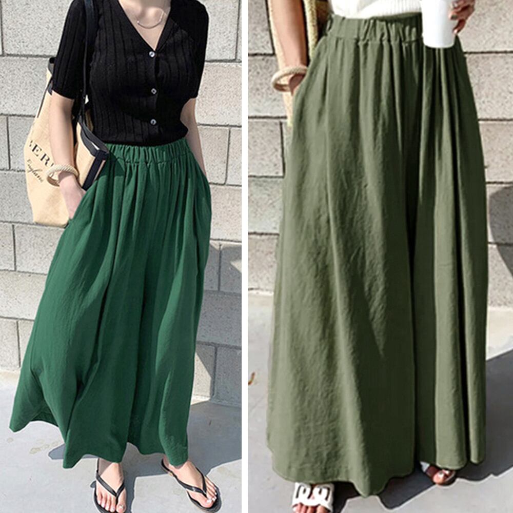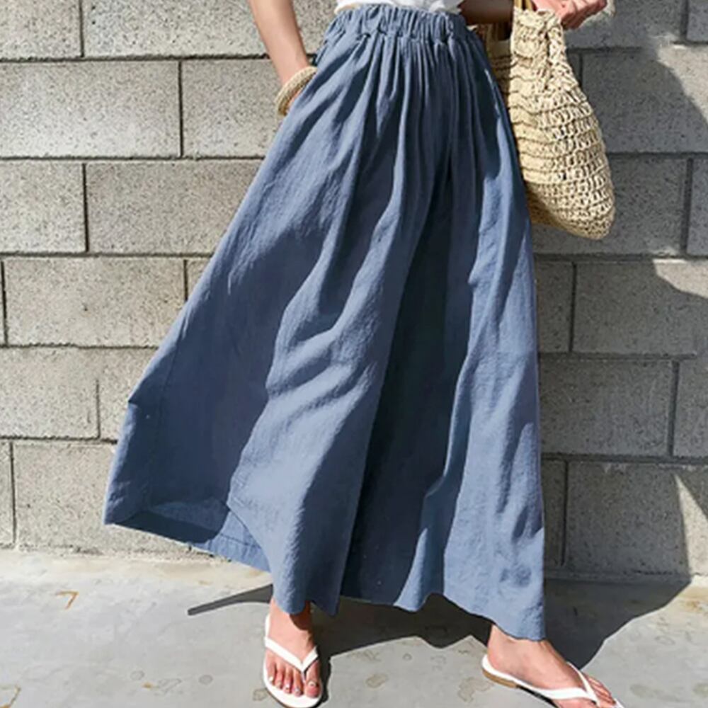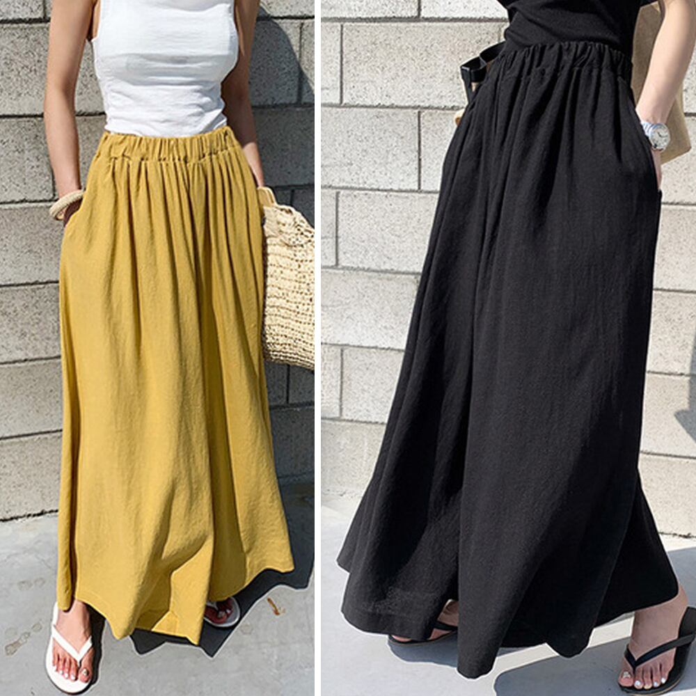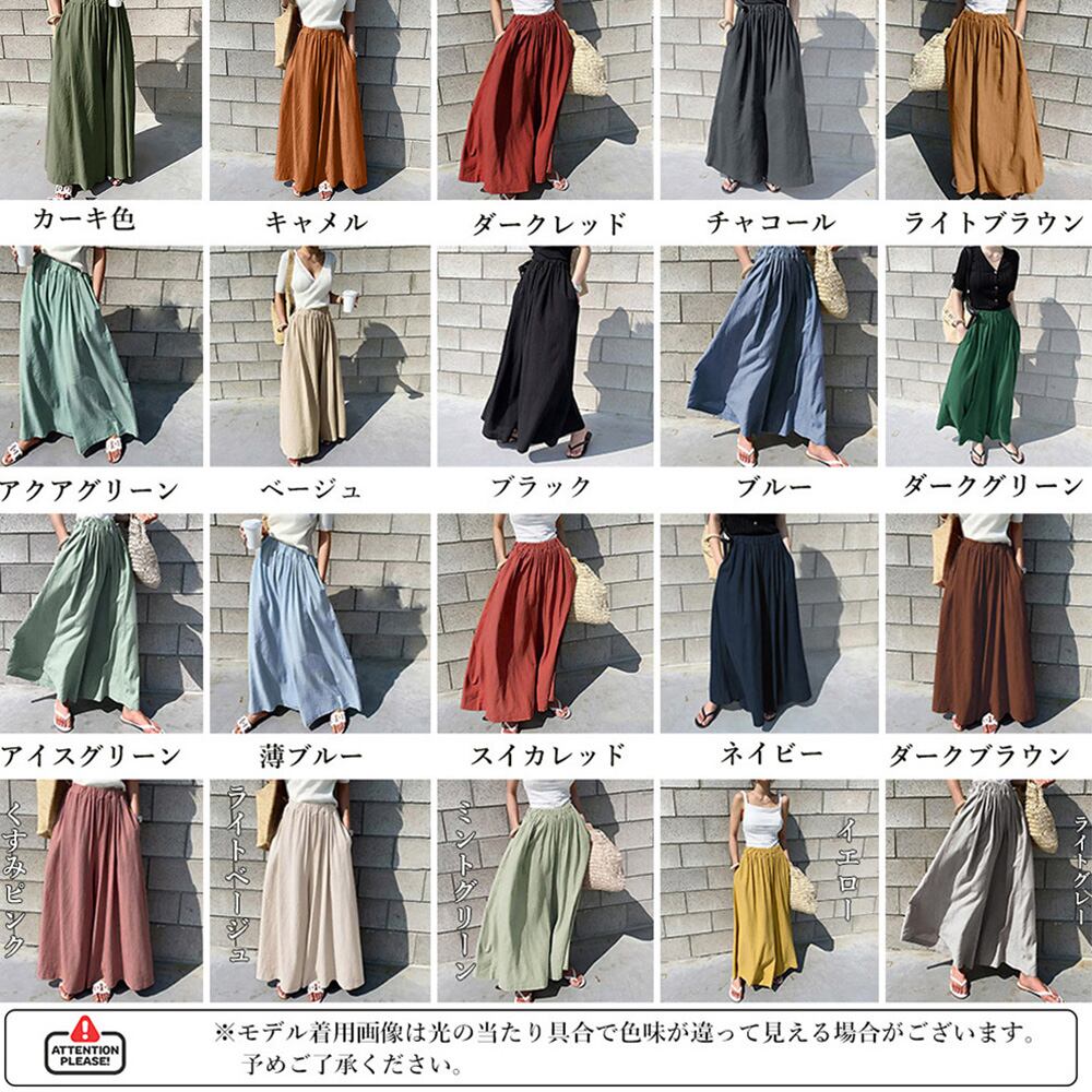 韓国ファッション リネン風 ワイドパンツ 薄手 春夏秋 ウエストゴム スカーチョ ゆったり 9分丈フレアパンツ