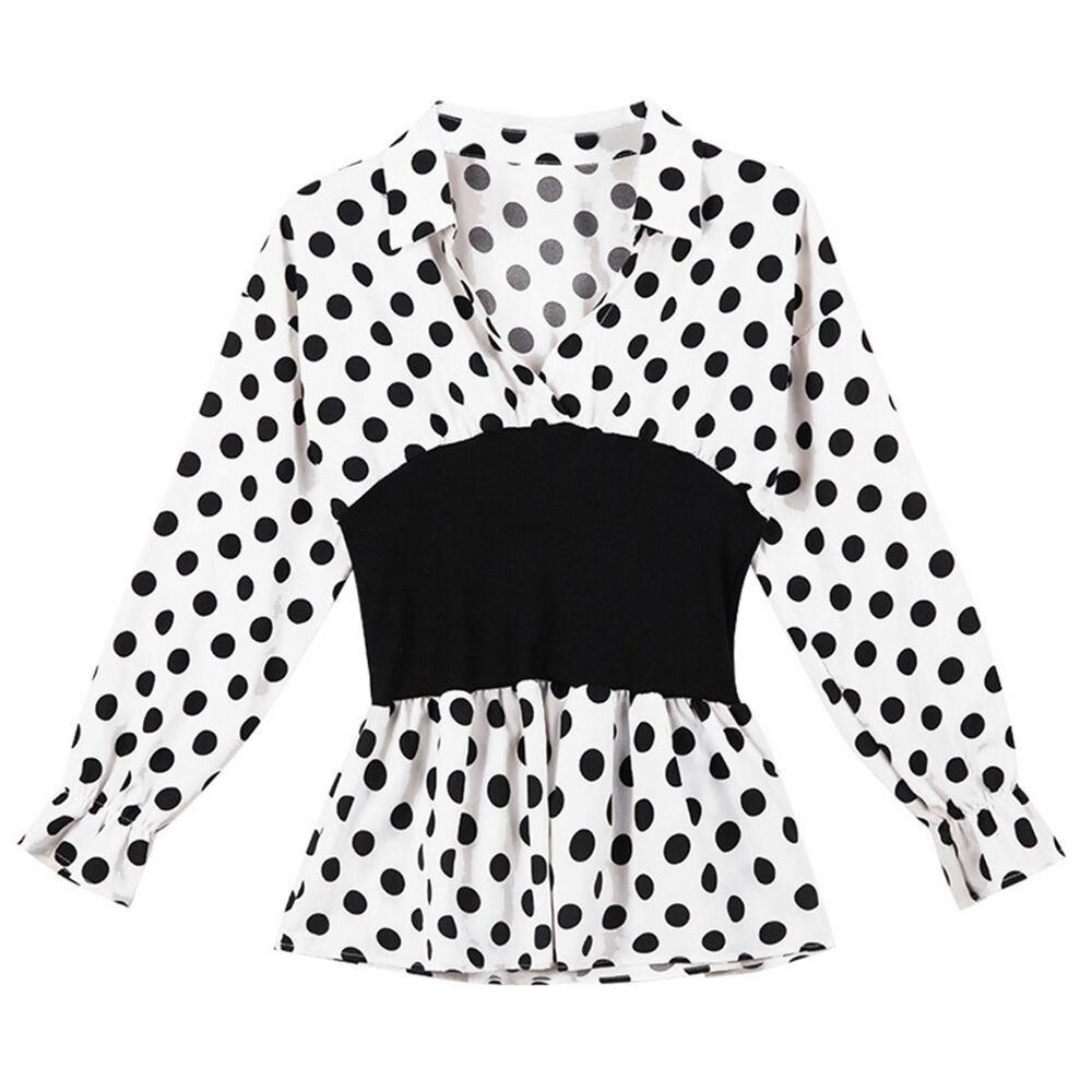 1枚でも着映え、大きめのドット柄が目を引く異素材切り替えウエストマークブラウス