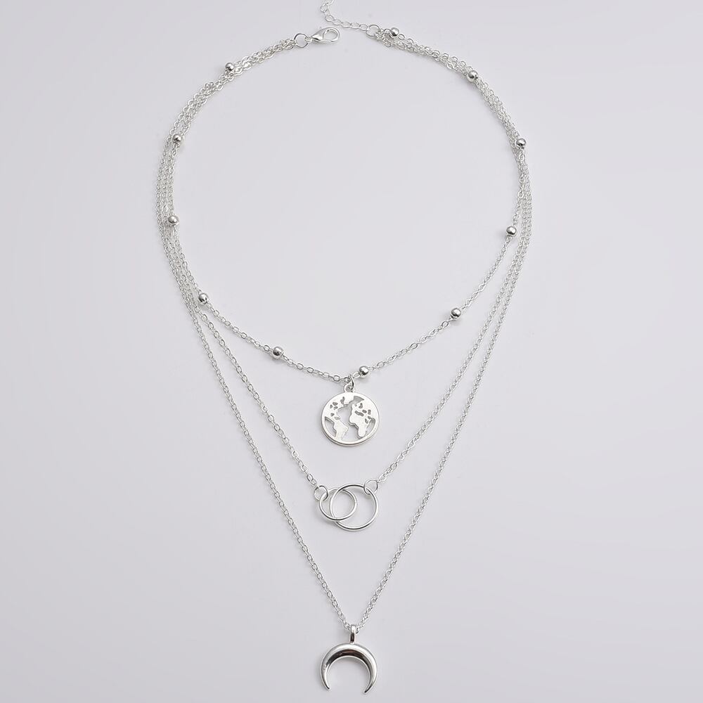 世界地図モチーフの透かしメダルとリングと月モチーフペンダントの3連ネックレス