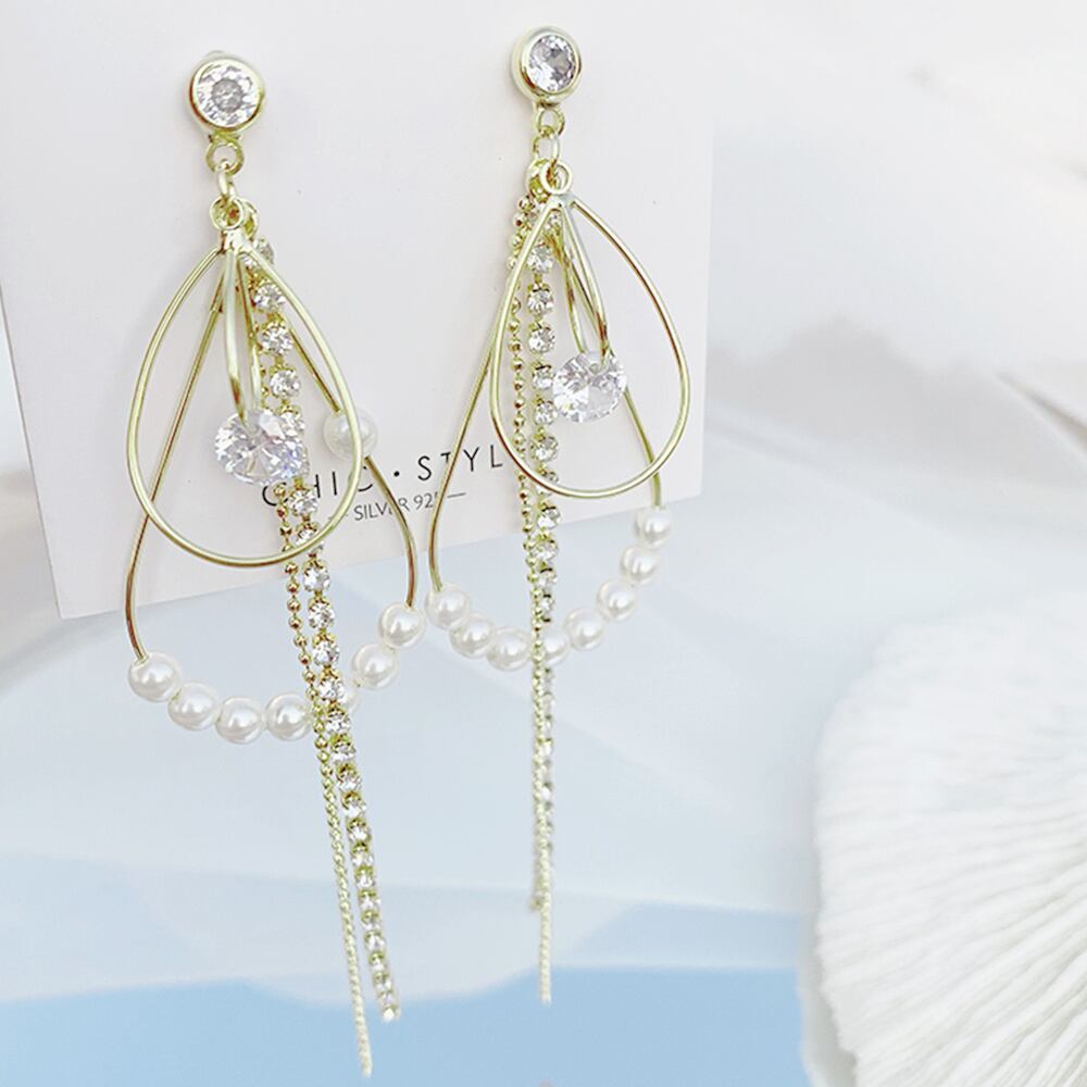 しずく型フレームにパールをつけてラインストーンチェーンを加えた大振りピアス