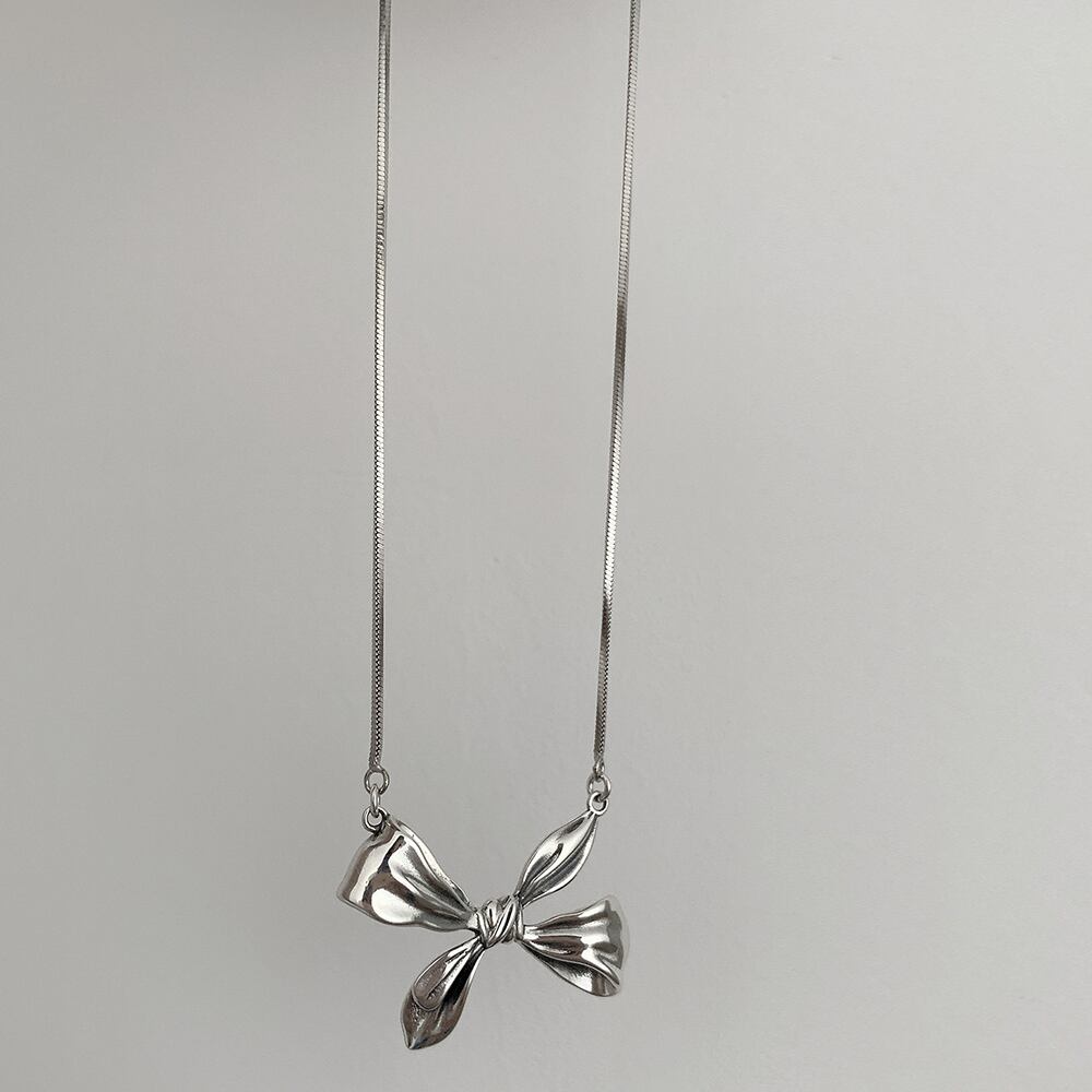 チェーンにリボンを添えた華奢なネックレスが登場しました。