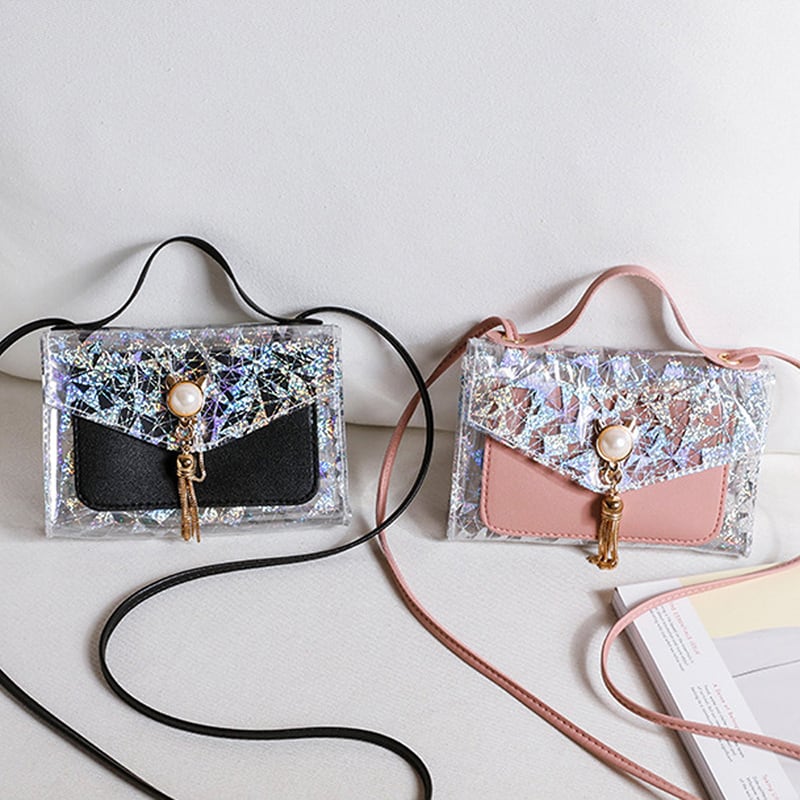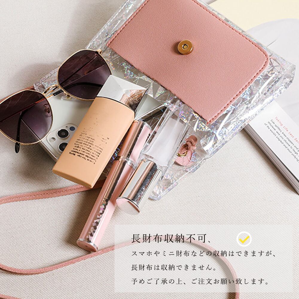 きらきら輝くオーロラ色のホログラムクリアビニール素材にマットな質感のフェイクレザー生地で仕上げた異素材mixショルダーバッグ