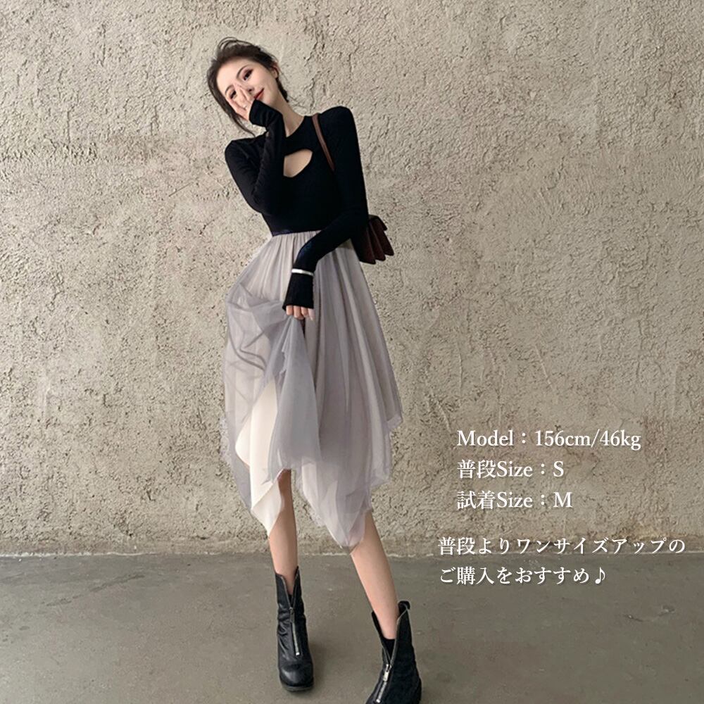 おしゃれ 異素材MIX チュールワンピース 長袖 ミニワンピ 着やせ 可愛い 春秋ワンピ カジュアル 胸元セクシー 韓国