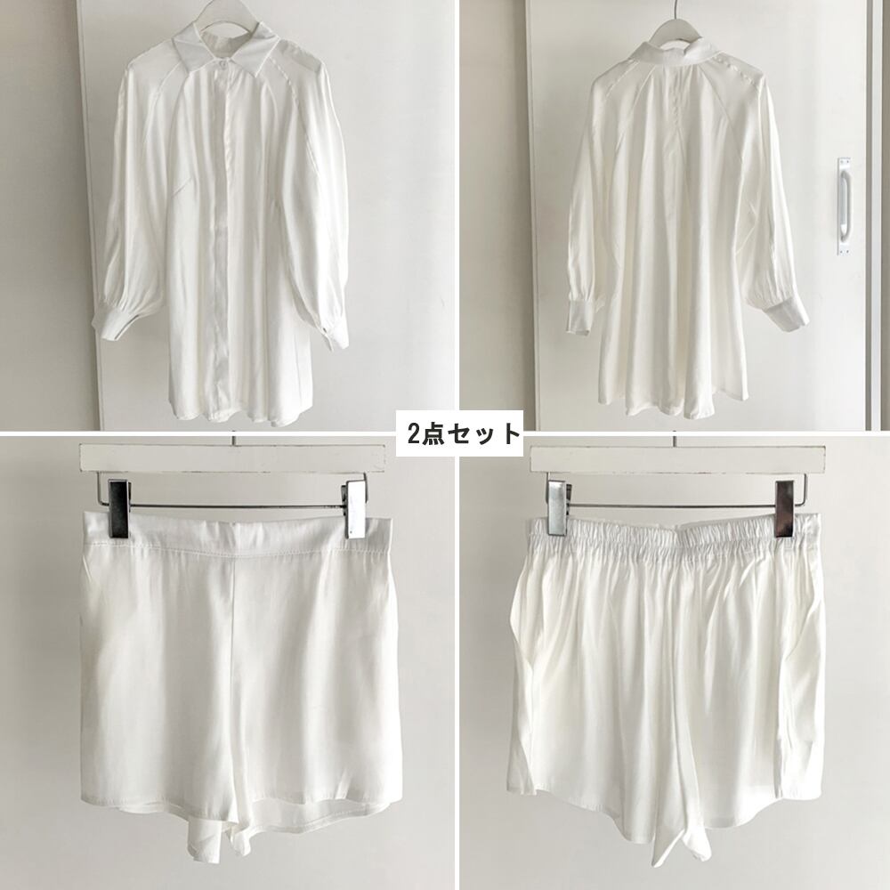 韓国 長袖シャツブラウス ショートパンツ 2点セット きれいめ ボリューム袖 カーディガン パフスリーブ トップス