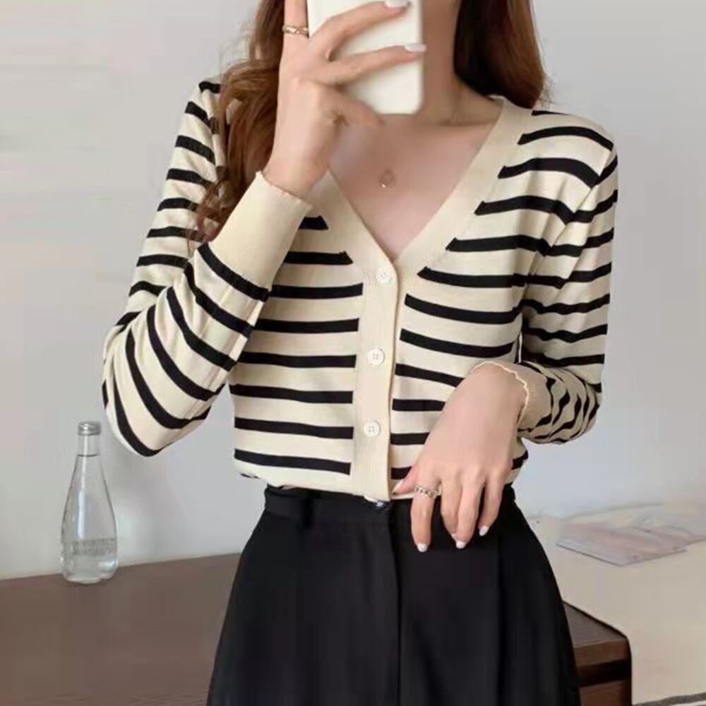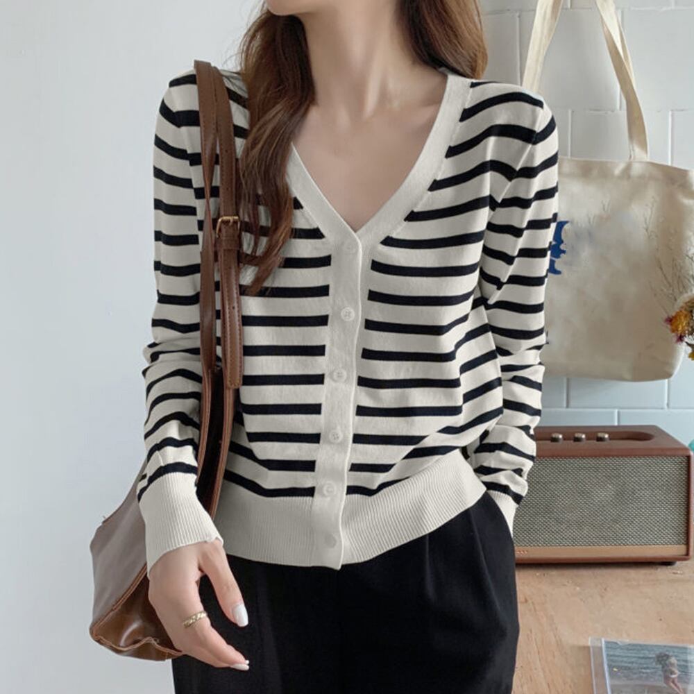 春秋ファッションに欠かせなくレディースボタン付きボーダー柄のニットカーディガン