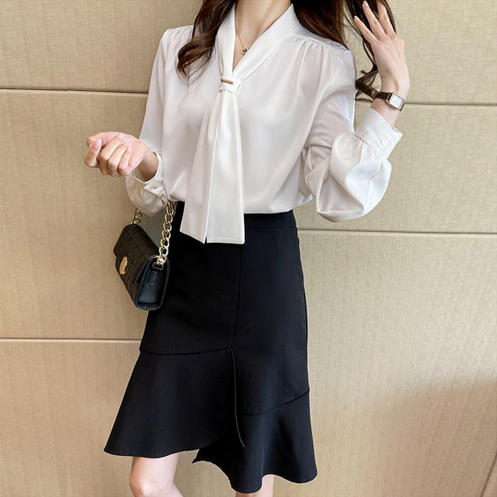 韓国風 上品 スカーフタイ トップス 長袖 とろみシャツ 白 春 シャツブラウス オフィスカジュアル ブラウス フェミニン