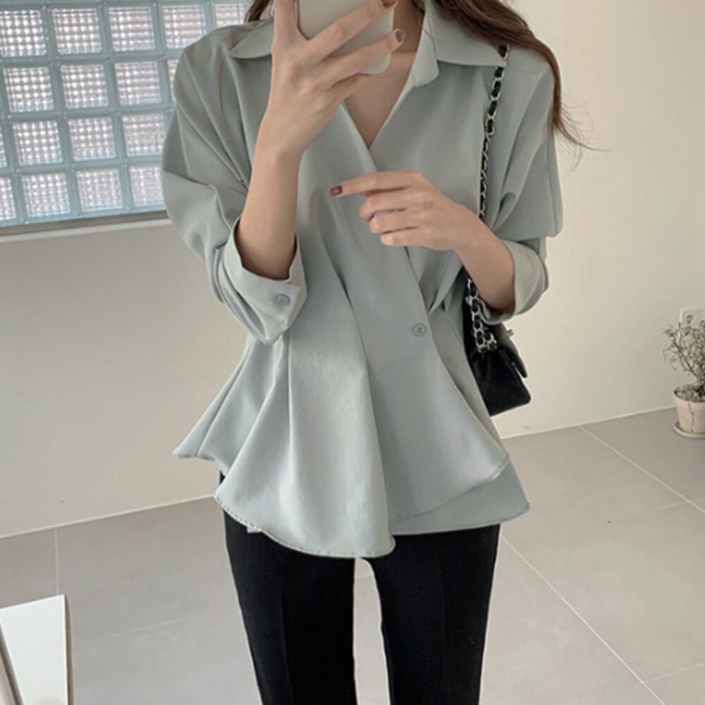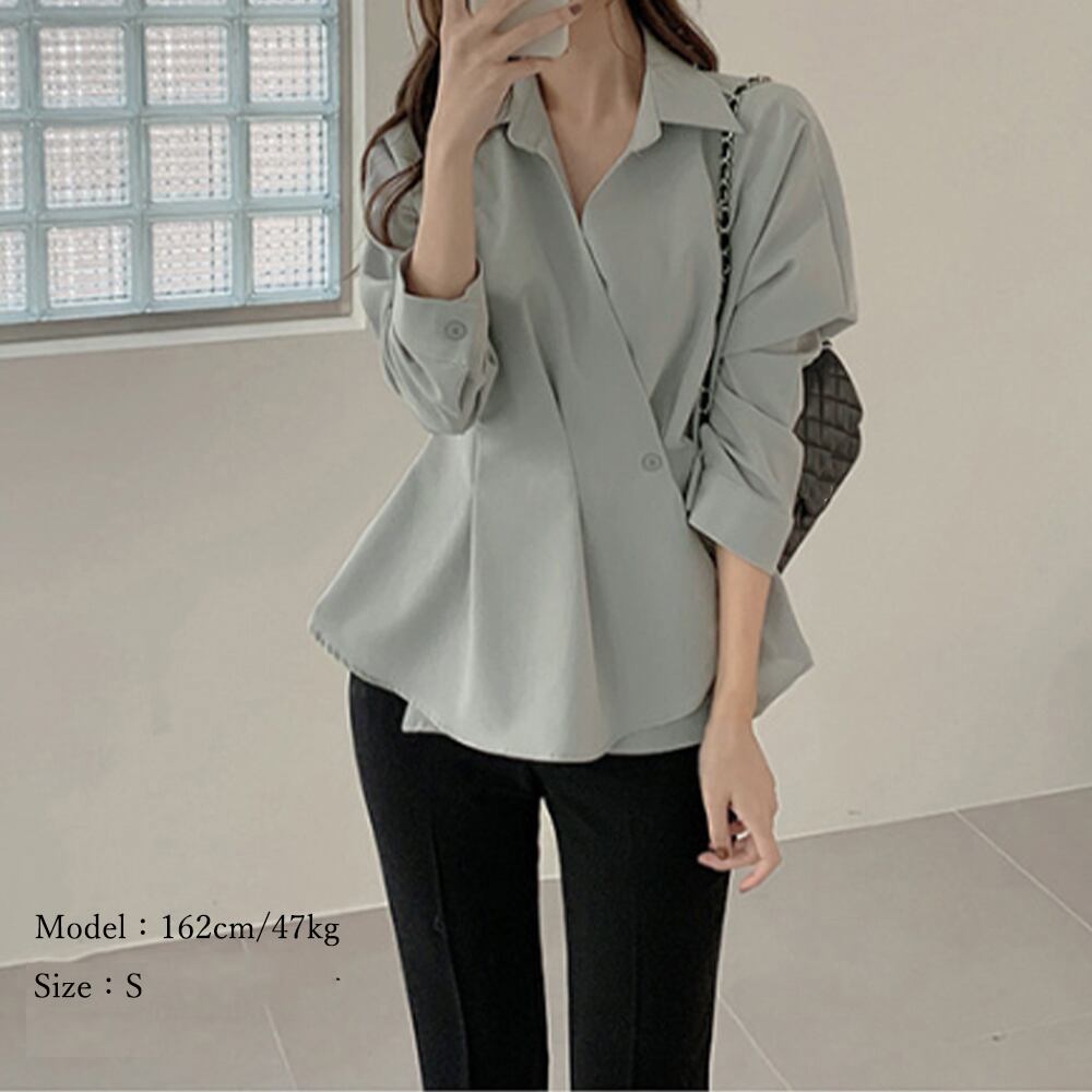 襟付き 長袖トップス オフィス とろみシャツ 体型カバー フレアシャツ 着やせ 韓国風