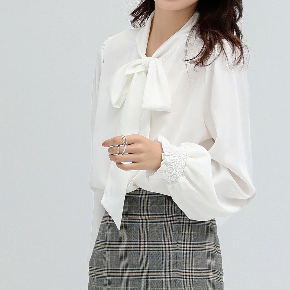 タイリボン 長袖 シャツブラウス タイネック 大人女性 無地 パフスリーブ 通勤 就活 着やせ 韓国 春夏服 きれいめ